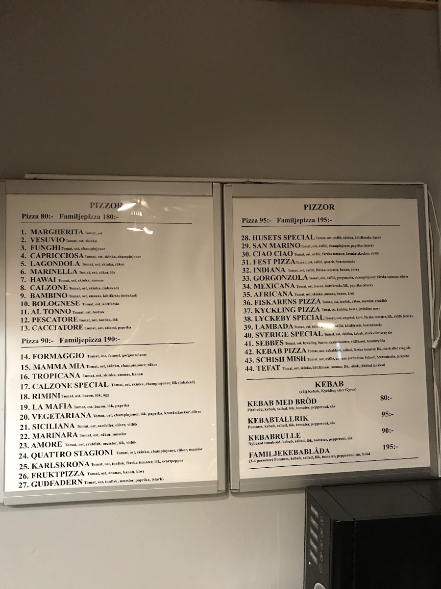 From a reviewer’s perspective, the menu at Pizzahuset Lyckeby offers a classic and satisfying selection of fast-food favorites, with a strong focus on pizzas, kebab dishes, and hearty à la carte meals. The sauce options such as Kebabsås Mild 20 Cl, Vitlökssås 20 Cl, Hamburgerdressing 20 Cl, Kebabsås Blandad 20 Cl, and Bearnaisesås 20 Cl complement the main dishes well, while sides like Nybakat Bröd, Pommes Frites, and Pizzasallad round out the meals. The à la carte section includes filling choices like Husets Schnitzel Med Pommes, Husets Hamburgare, and Husets Lövbiff Med Pommes. The kebab menu features options such as Kebab, Gyros, and Kyckling in different sizes, alongside pizzas like Calzone and specialty options including Inbakad, Standard, Barnpizza, Familjepizza, and Dubbel Botten. Fresh salads like Tonfisksallad, Räksallad, Grekisk Sallad, Kycklingsallad, and Kebabsallad, plus drinks such as Fanta Orange 33 Cl, Coca-Cola Zero 33 Cl, Loka Citrus 33 Cl, and Sprite 33 Cl, complete a menu that feels varied, affordable, and well-suited for both quick meals and family dining.